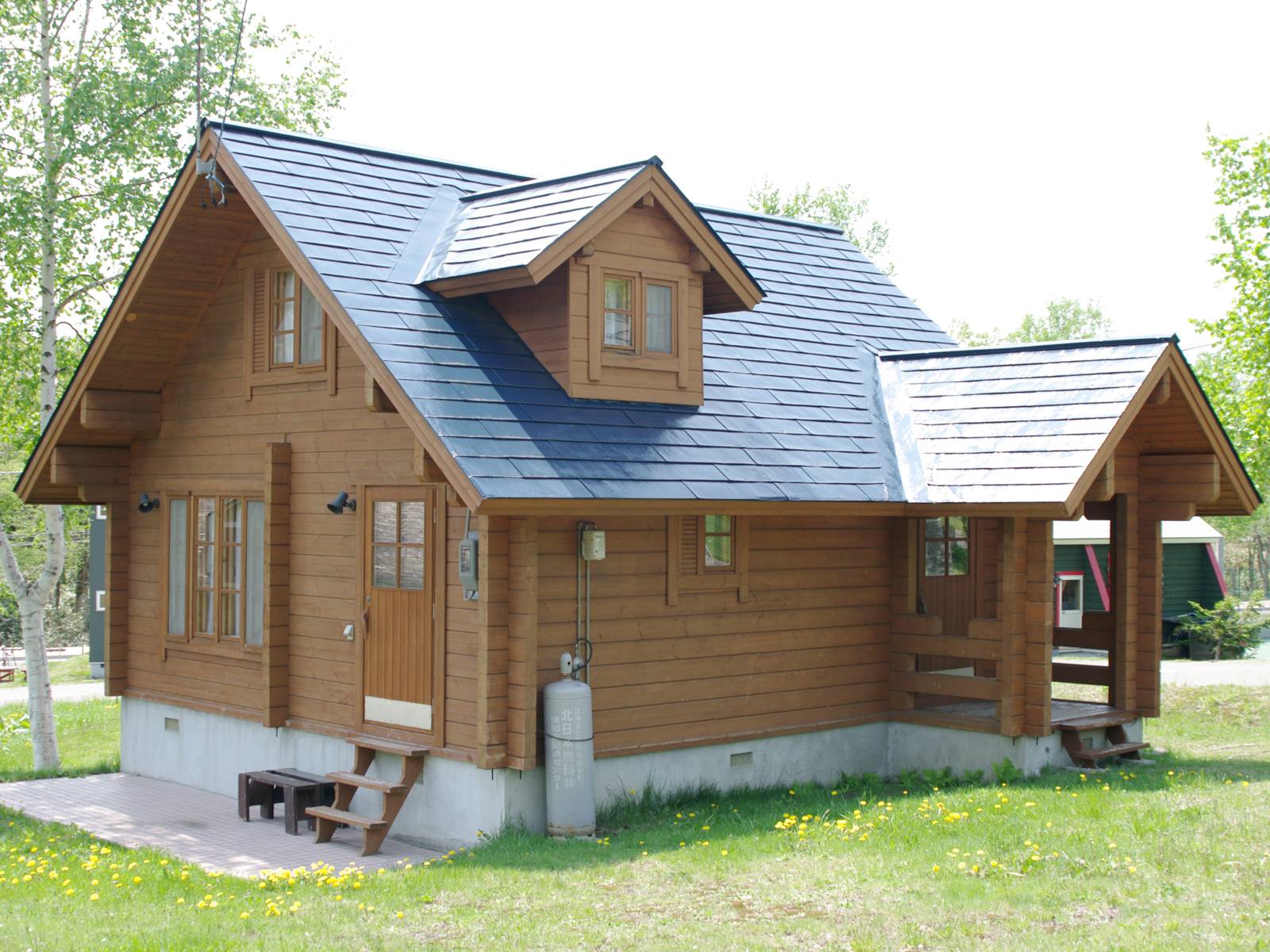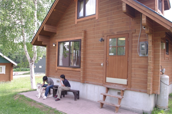 ペットと一緒に宿泊が可能な、長く親しまれ続ける佇まいの2階建てフィンランドログハウスです。ベッドが入ったツインルームの他、フローリングの寝室、カーペットのお部屋にはお布団を敷いてご利用いただけます。