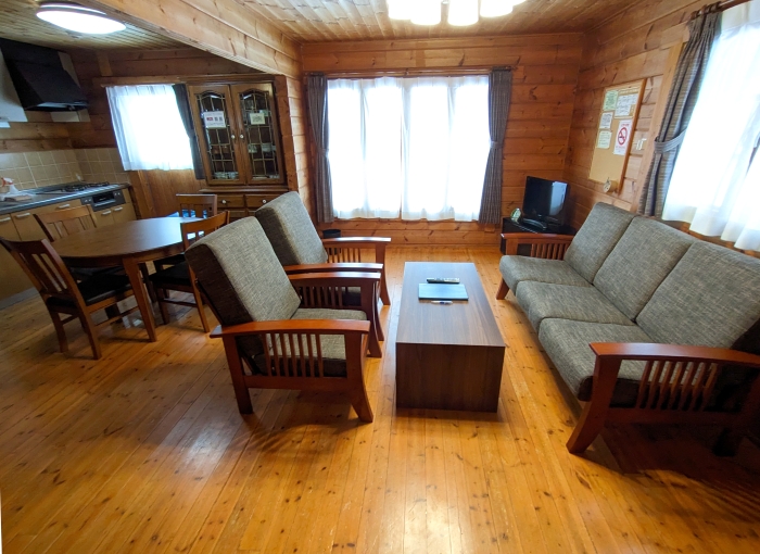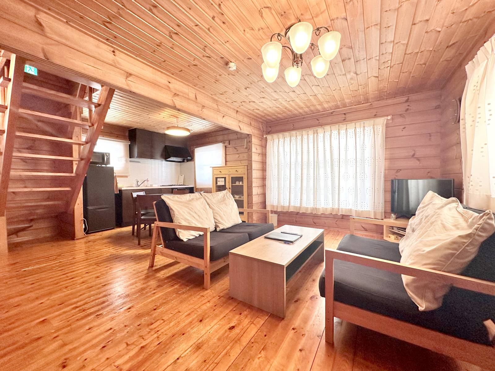 ペットと泊まれる人気コテージ。広々としたリビングとBBQ設備を備え、家族みんなで快適に滞在できます。